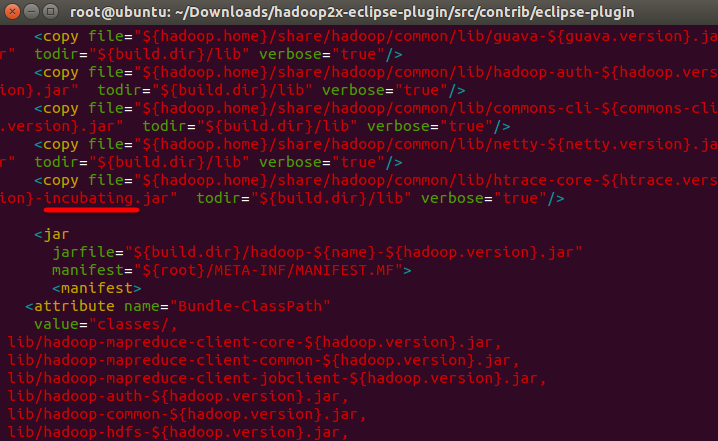 对于htrace-core-3.1.0-incubating.jar,除了把 properties中的版本号改为3.1.0,还要编辑hadoop2x-eclipse-plugin/src/contrib/eclipse- plugin目录下的build.xml,增加下图红色标示的单词。