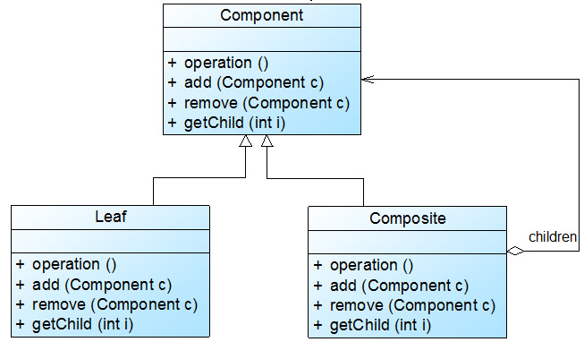- ①、定义了包含leaf对象和composite对象的类层次接口—— 递归结构