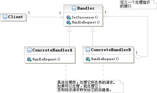 ②、ConcreteHandler:处理它所负责的请求,可访问它的后继者,如果可处理该请求,就处理之;否则将该请求转发给它的后继者