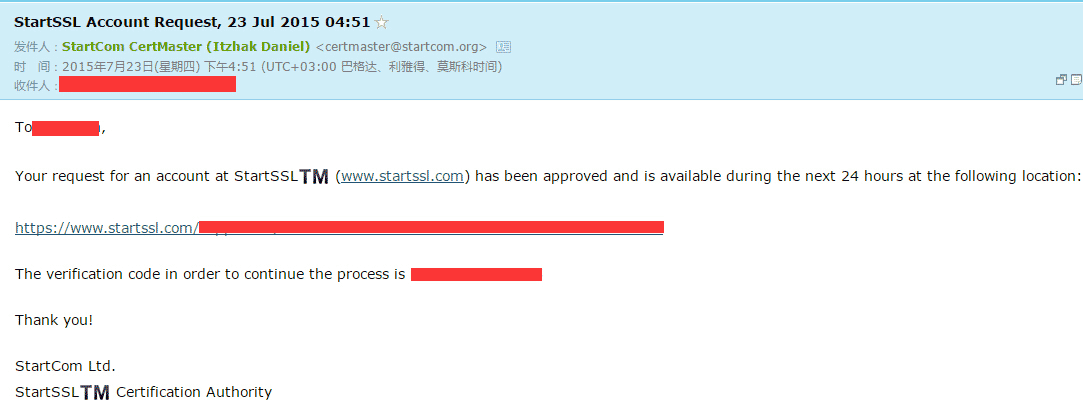 下面需要输入Verification Code,StartSSL会将其发送到上面填写的邮件中。