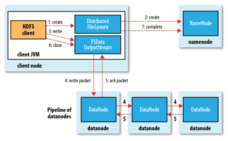 - 将数据块写入一个DataNode,然后这个DataNode将数据块发送给另一个DataNode。。。