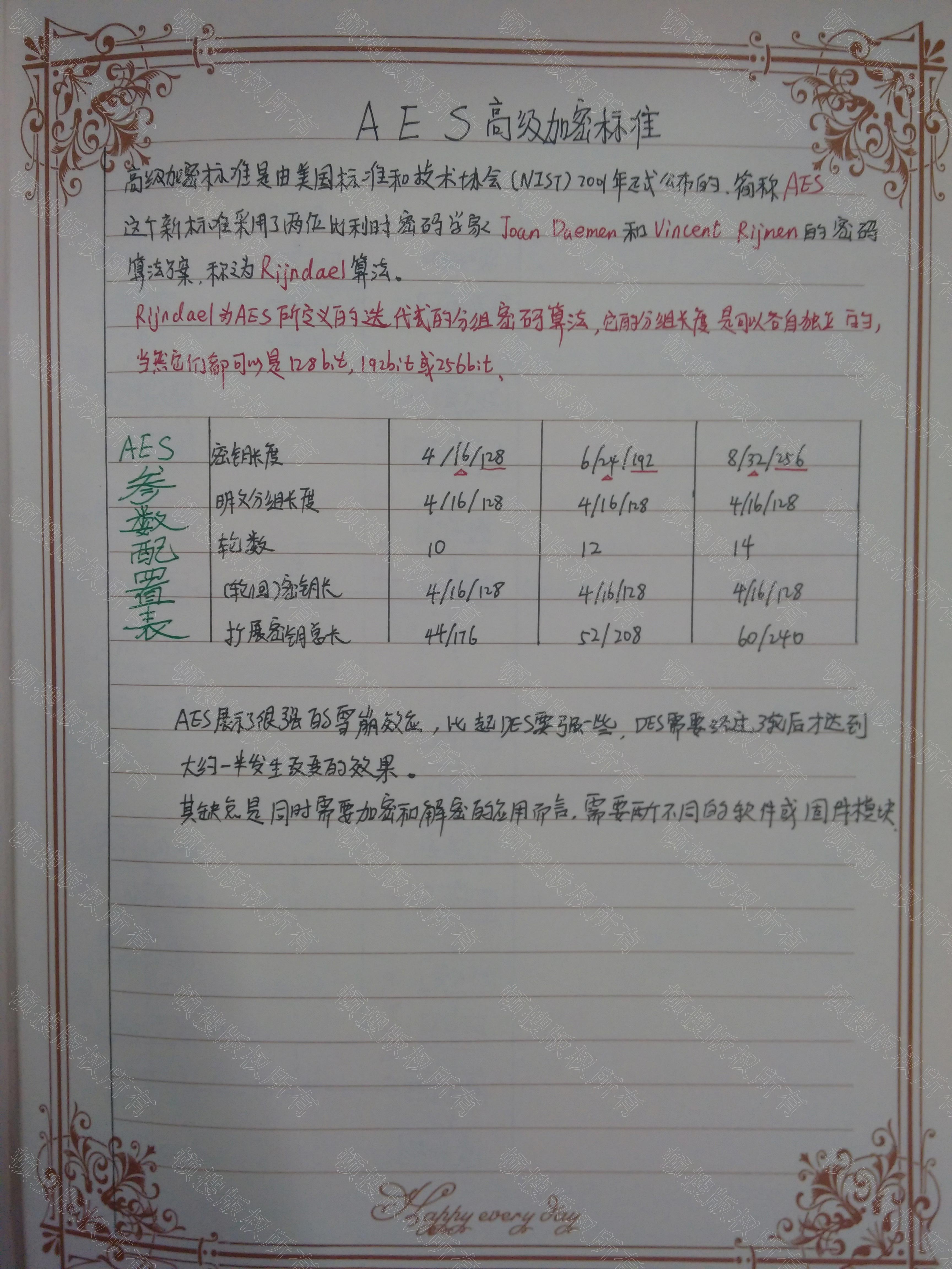 高级加密标准是由美国标准和技术协会(NIST)2011年正式公布的,简称AES,这个新标准采用了两位比利时密码学家Joan Daemen 和 Vincent Rijmen的密码算法方案,称之为Rijndael算法。Rijndael算法为AES所定义的迭代式的分组密码算法,它的分组长度是可以各自独立的。