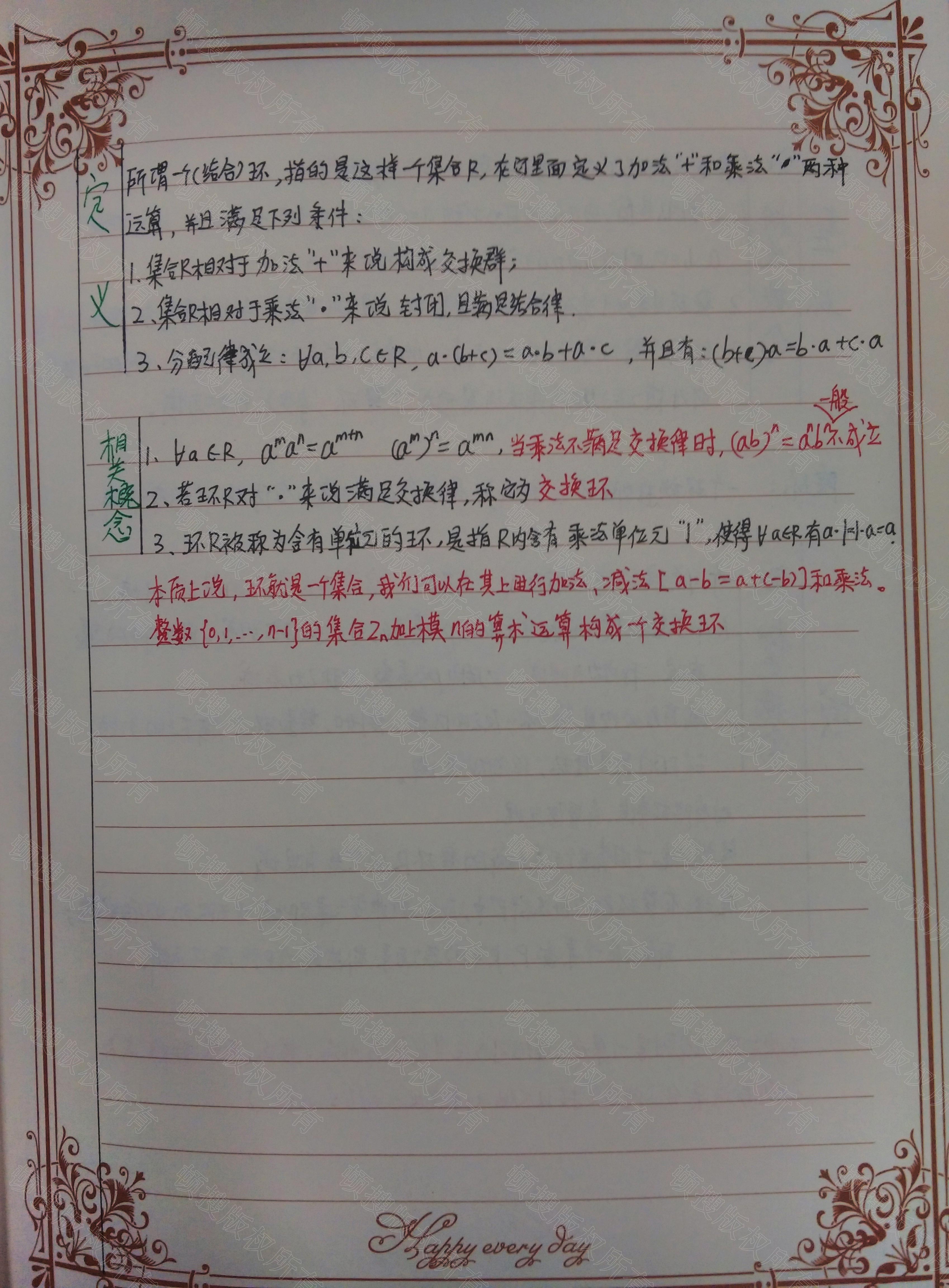 群、环、域都是数学理论中的一个分支——即抽象代数或称为近代代数的基本元素。在抽象代数中,我们关心的是其元素能进行代数运算的集合。也就是说,可以通过很多种方法,是集合上的两个元素组合得到集合中的第三个元素。这些运算的方法都遵循特殊的规则,而这些规则又能确定集合的性质。