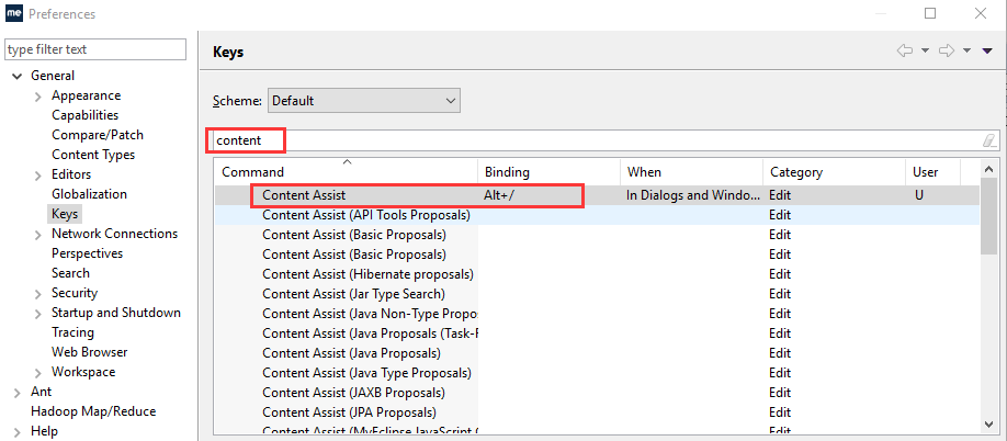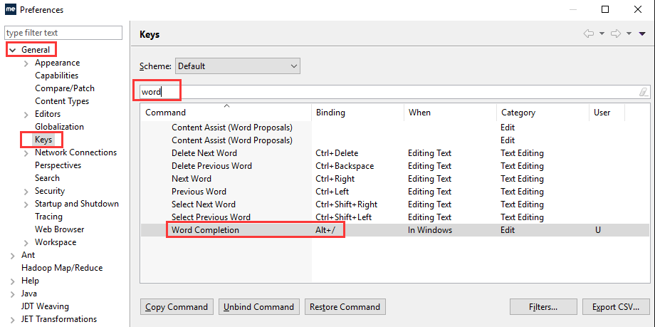 打开MyEclipse,依次点击Windows—>Preference->General->keys ,然后输入word进行过滤,看到如下界面。