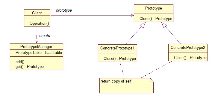 原型模式涉及“客户端”(Client)角色、“抽象原型(Prototype)角色” 、“ 具体原型(Concrete Prototype)角色”及“原型管理器(PrototypeManager)角色” 。