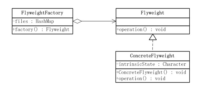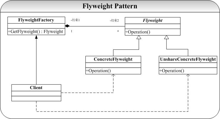 享元模式涉及到Flyweight(享元角色),ConcreteFlyweight(具体享元角色),UnsharedConcreteFlyweight(复合享元角色),FlyweightFactory(享员工厂角色),Client(客户端)等五个角色。