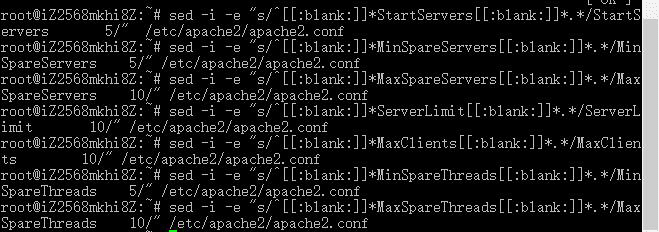 sed -i -e "s/^[[:blank:]]*MaxSpareThreads[[:blank:]]*.*/MaxSpareThreads 10/" /etc/apache2/apache2.conf然后输入以下命令重启Apache2