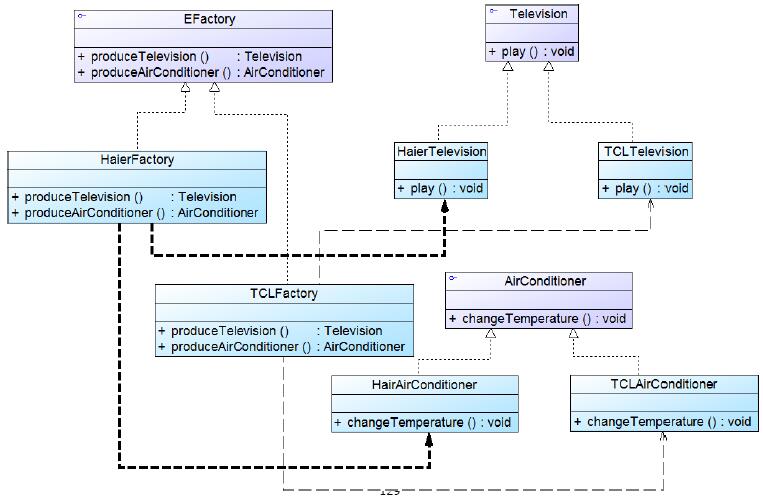 一个电器工厂可以产生多种类型的电器,如海尔工厂可以生产海尔电视机、海尔空调等,TCL工厂可以生产TCL电视机、TCL空调等,相同品牌的电器构成一 个产品族,而相同类型的电器构成了一个产品等级结构。如何使用工厂模式创建对应的产品。会发现,相同产品分为了两家生产,显然工厂方法模式不在适用。