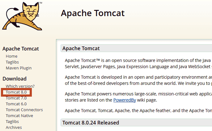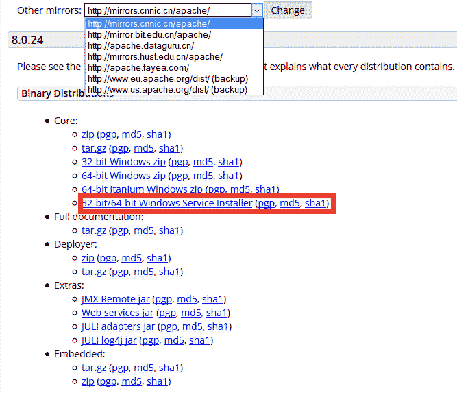 点击左边的Tomcat8.0,进入到下载页面,选择好镜像地址和下载版本。