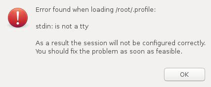 点击OK,进入系统后,在终端中用命令gedit /root/.profile,打开文件后找到“mesg n”,将其更改为“tty -s && mesg n”即可(不带引号)。
