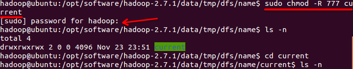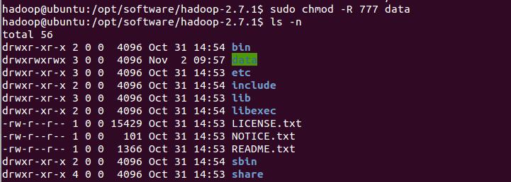 切换到/opt/software/hadoop-2.7.1/ ,首先赋予data目录及子目录权限。