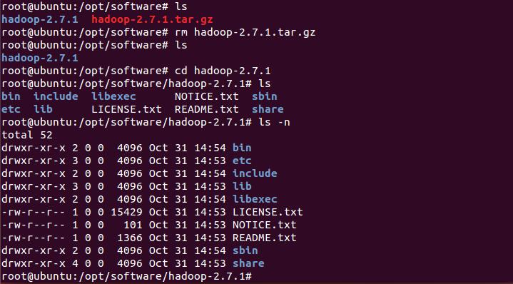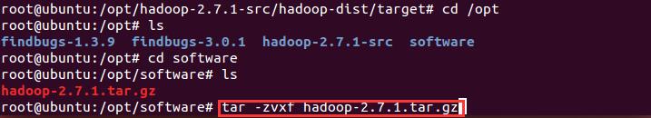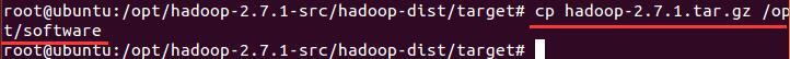 cp hadoop-2.7.1.tar.gz /opt/software然后切换到/opt/software目录下,解压hadoop