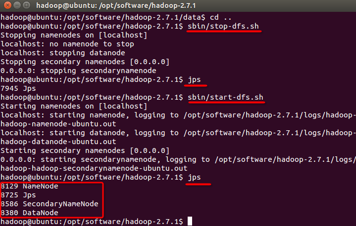 sudo chmod -R 777 current然后使用sbin/stop-dfs.sh停止开启的服务,使用jps检查服务是否已停止,然后使用sbin/start-dfs.sh开启服务,使用jps检查是否成功开启。可以看到,NameNode、DataNode、SecondaryNameNode都已经成功启动了