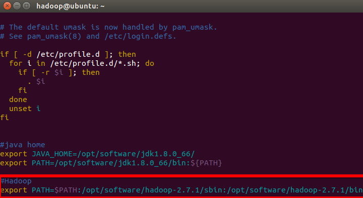 export PATH=$PATH:/opt/software/hadoop-2.7.1/sbin:/opt/software/hadoop-2.7.1/bin然后执行source /etc/profile 是配置文件生效即可。