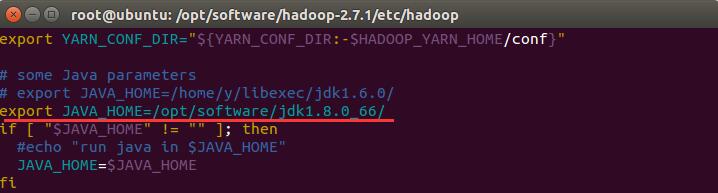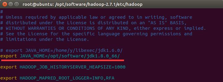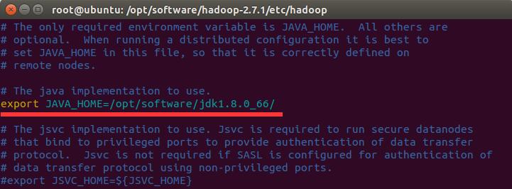 sudo vim hadoop-env.sh然后将JAVA_HOME的值设置为/opt/software/jdk1.8.0_66