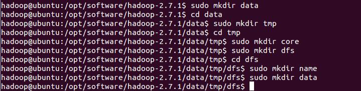 sudo mkdir data然后切换到/opt/software/hadoop-2.7.1/etc/hadoop目录下,编辑core-site.xml文件